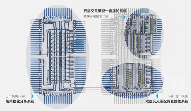 配置兩套雙層小件分揀機系統(tǒng)用于快遞包裹進口小件郵件處理,配置一套矩陣擺輪分揀系統(tǒng)用于快遞包裹進口大件、總包郵件的處理和傳輸;